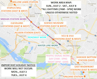 WEEKLY RE-CAP Sun., June 25 - Sat., July 1This week on Broad Street, station construction continued at Allison East; Cleveland East and West; Science Museum East and West; Staples Mill East and West; and VCU/VUU East and West stations. On E. Main Street, station construction continued at Orleans, East Riverfront and Shockoe Bottom East. Waterline relocation is expected to finish at Willow Lawn, shifting to Arts District West next week. Traffic signal work progressed on Broad St. and E. Main Street.